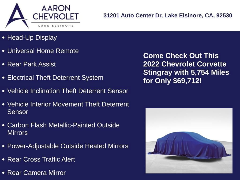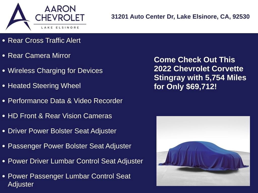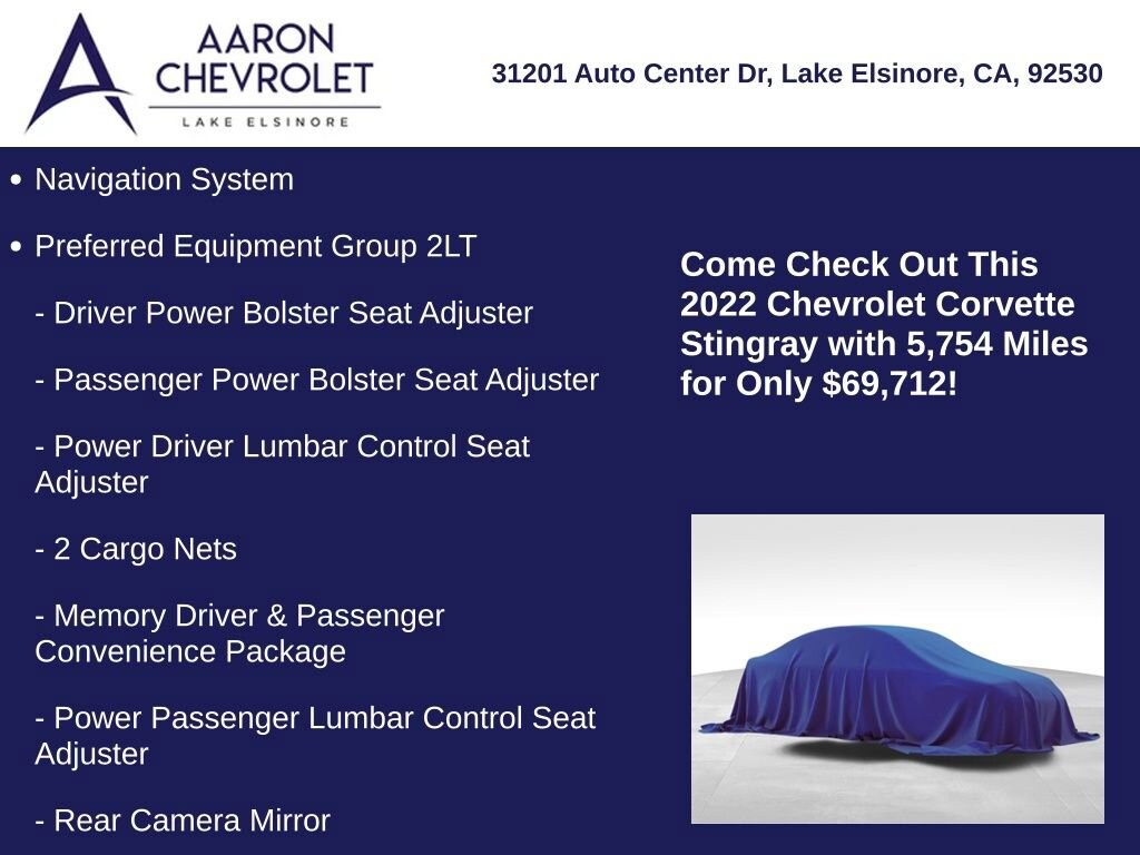 With its exceptional performance, advanced features, and timeless design, the 2022 Chevrolet Corvette Stingray 2LT is a true masterpiece of automotive engineering. We invite you to experience the power and passion of this remarkable sports car for yourself. Schedule a test drive today and discover the true meaning of driving excitement.