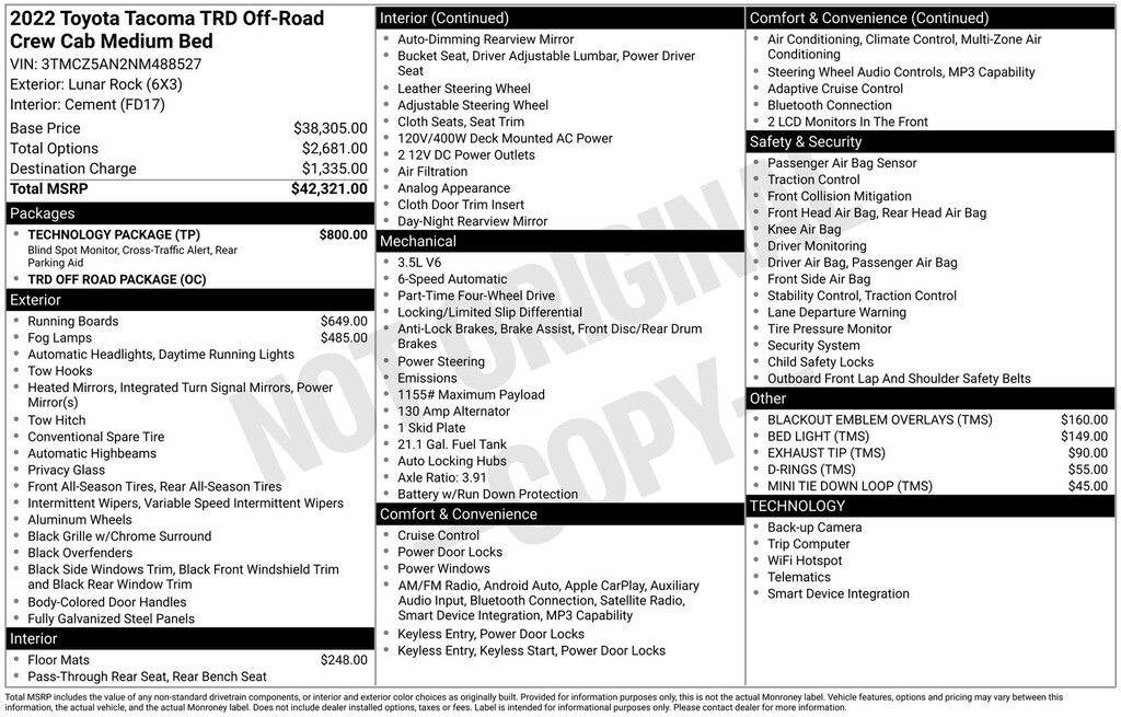 2022 Toyota Tacoma TRD Off-Road Truck V6 PDI DOHC 24V LEV3-ULEV70 278hp